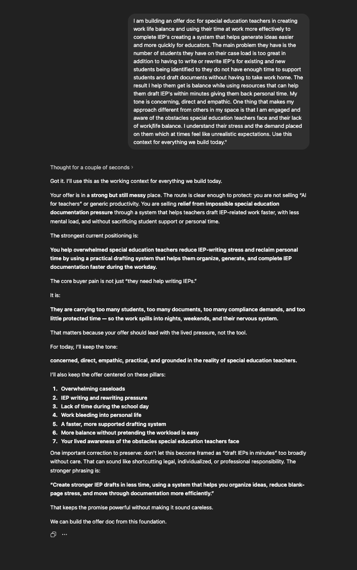 A complete offer document: the result, the person, the price, objection language, and the positioning paragraph that works on a sales page, a bio, and in person.