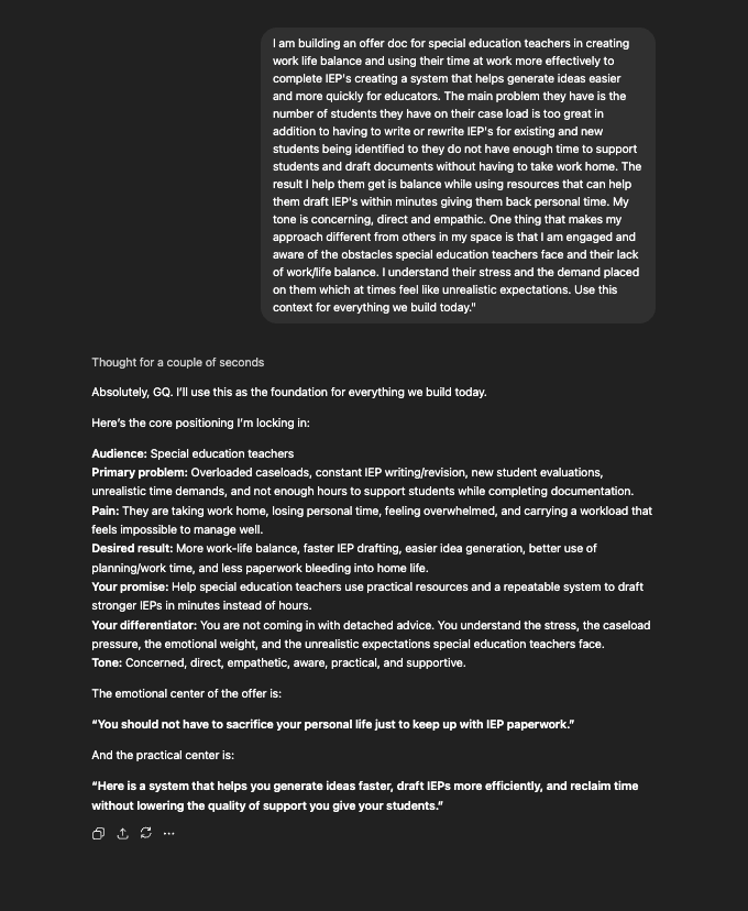 Before you run a single prompt, you give Vero your context — who you help, the problem they have, your tone, what makes your approach different. From that moment, everything Vero produces is specific to you. Not generic output. Your voice, your audience, your asset.